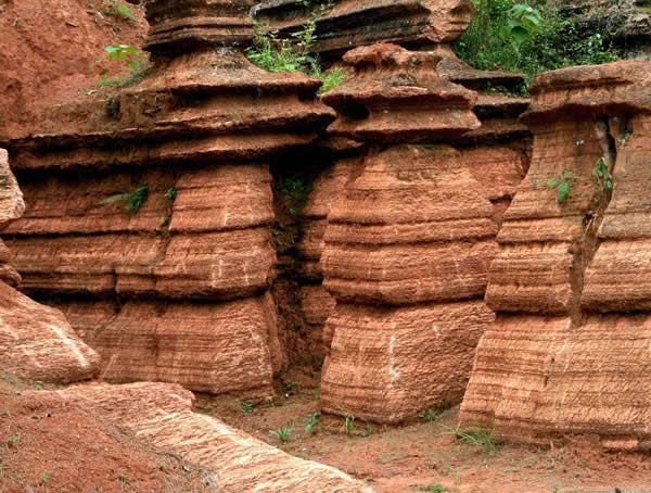 這些石柱不但顏色各異,而且大小不等。有的高達(dá)七、八米,而有些則像半埋于地下的巨獸骨架。一位村民告訴記者,現(xiàn)在石林沒(méi)有以前壯觀,都長(zhǎng)渣子(灌木)了。原因是由于山頂樹(shù)木減少,雨水將泥土帶下山,很多石頭都被埋在土下,后來(lái)這些地方都開(kāi)墾了農(nóng)田,石林也被永久覆蓋。