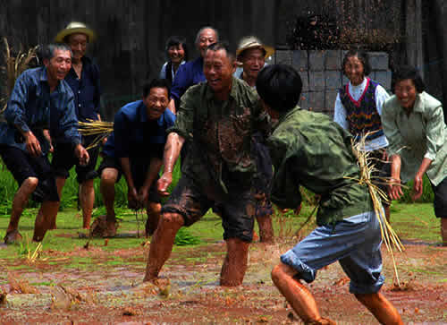 插秧活動的最后一天,叫做“關秧門”。一丘田里,聚集了很多幫忙插秧的人,大家心里都憋著一股勁,看誰秧插得最快。速度慢人往往會被插得快的人圍住,最后關在秧田中間出不來,這叫“關豬籠”。這時候,速度快的人就會走上田埂,抓起稀泥團朝被關了豬籠的人扔去,也有專門砸主人一身稀泥的,岸上也有人澆水。主人身上被砸的稀泥越多,主人越高興。在關秧門的最后時刻,人們會在田野里上演一場你追我趕的游戲,土家人把它叫做“糊倉”。在“糊倉”的過程中,誰也不會記仇,大家你追我趕,場面極其熱鬧。