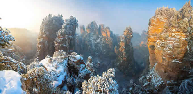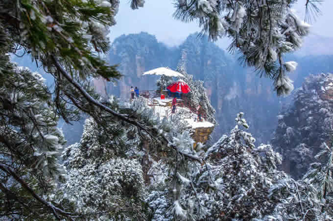 楊家界雪景 作為世界自然遺產(chǎn)武陵源四大核心景區(qū)之一的楊家界景區(qū),地勢(shì)險(xiǎn)要,風(fēng)景絕美,跟張家界、天子山、索溪峪比較,其中的地質(zhì)地貌一部分相同外,又有其獨(dú)特的資源優(yōu)勢(shì),擁有全球罕見的峰墻群奇光。乘坐在舒適的楊家界索道里,可以盡情體驗(yàn)“會(huì)當(dāng)凌絕頂,一覽眾山小”的居高臨下與動(dòng)感,360度暢游夢(mèng)想般的楊家界仙界,俯瞰“近在咫尺”的千山萬壑,山舞銀蛇,千嬌百媚的絕美“峰墻”盡收眼底,無限風(fēng)光在險(xiǎn)峰,數(shù)十道氣勢(shì)如虹的石墻,一排排層巒疊嶂,相對(duì)平行而立,高矮參差不齊,宛如“天然長(zhǎng)城”,真是美輪美奐,絕景天賜,不得不讓人驚嘆大自然的璧山開地之功。
