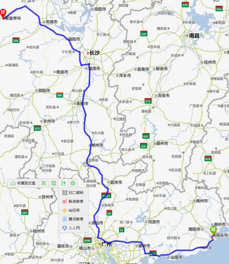 汕頭去張家界自駕車(chē)自助游線路圖全程高速):