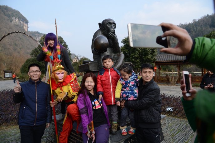 手持金箍棒,頭戴紫金冠。2月2日,農(nóng)歷臘月二十四,中國(guó)傳統(tǒng)小年節(jié)氣。當(dāng)天下午,旅游勝地張家界武陵源黃龍洞景區(qū),一名“美猴王”打扮的特殊游客現(xiàn)身“后天”雕塑、龍宮大廳、花果山等景點(diǎn),其惟妙惟肖的“孫悟空”動(dòng)作表演,不時(shí)引來其他游客的驚呼:大圣歸來!