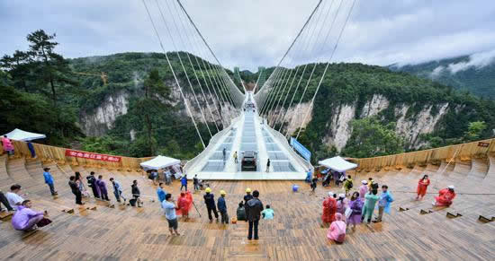 張家界大峽谷玻璃橋位于湖南省的張家界大峽谷景區(qū)栗樹埡和吳王坡區(qū)域內(nèi),為一座景觀橋梁,兼具景區(qū)行人通行、游覽、蹦極、溜索、T臺等功能。主跨430米,一跨過峽谷,橋面長375米,寬6米,橋面距谷底相對高度約300米。這座全透明玻璃橋長度、高度位居世界第一玻璃橋建成后,將成為世界首座斜拉式高山峽谷玻璃橋;并創(chuàng)下世界最高最長玻璃橋、首次使用新型復(fù)合材料建造橋梁等多項(xiàng)世界之最。